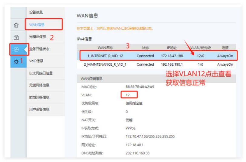 设置应用保存后,检查光猫拨号状态获取信息—状态为Connected,获取IP地址信息正常