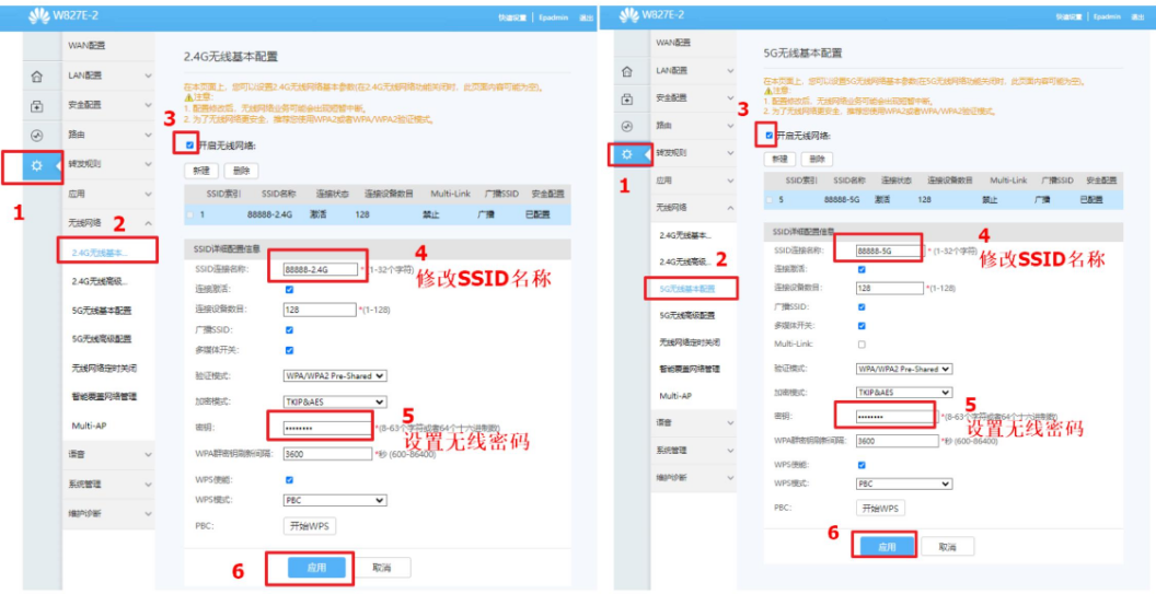 登录进入到无线设置窗口,选择 “开启无线网络”打勾,修改使用的SSID(WIFI名字)名称和密码(注意2.4G和5G频段各修改一次)。