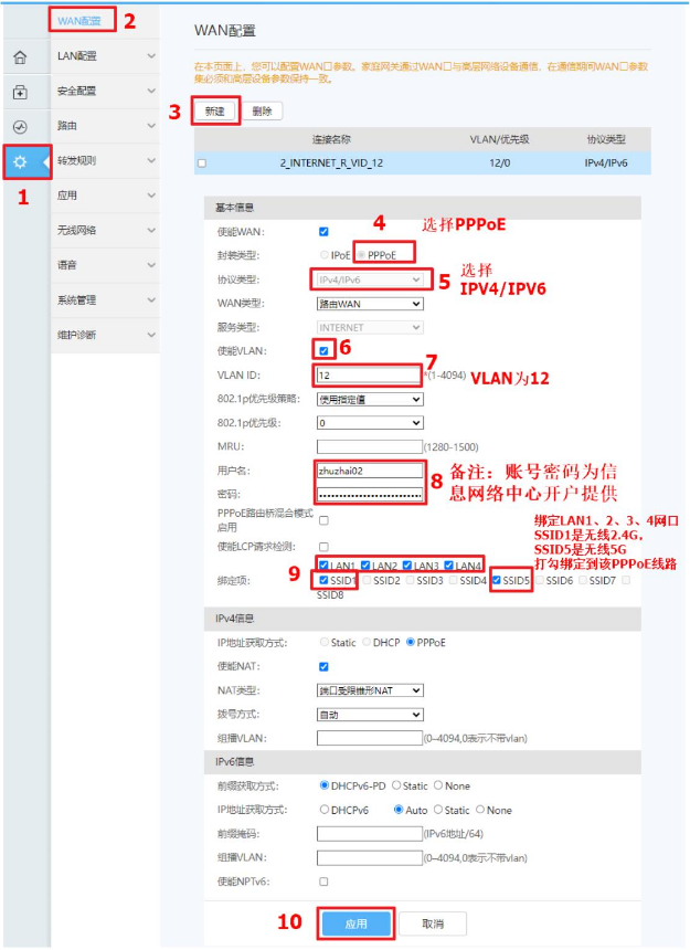 登录进入WAN配置,在对应PPPOE拨号窗口进行配置修改(如下图)
